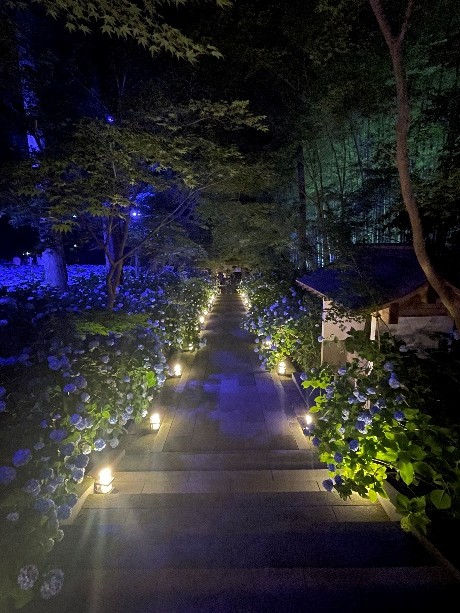 「あじさい寺」とも呼ばれ、紫陽花が咲き誇り、まるで青い絨毯のような幻想的な風景が広がります。