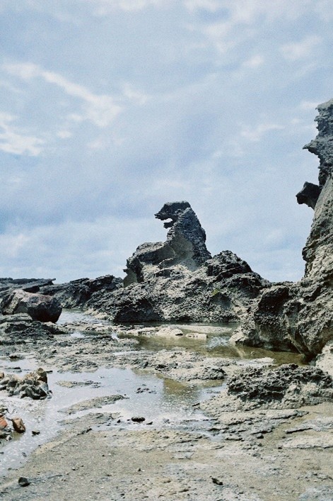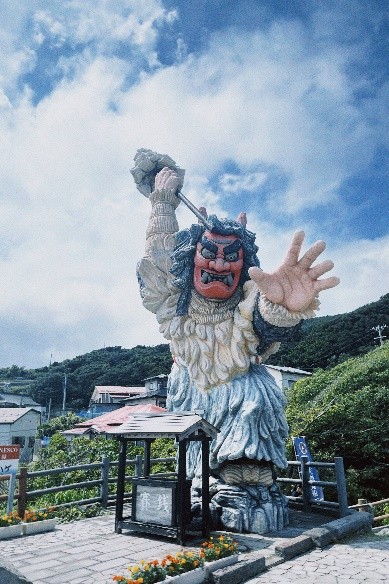 男鹿半島のゴジラ岩は、海に向かって立つ岩がまるで実際の映画のように見えるユニークな場所です。近くにおしゃれな灯台や迫力のある大きなナマハゲの像があります。