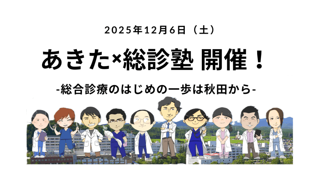 12月6日秋田大学医学部総1講義室にてあきた×総診塾が行われました。大学の講義などでよく耳にする総合診療科とはどんな診療科でその魅力とは何なのか気になっていたため、今回参加させていただきました。