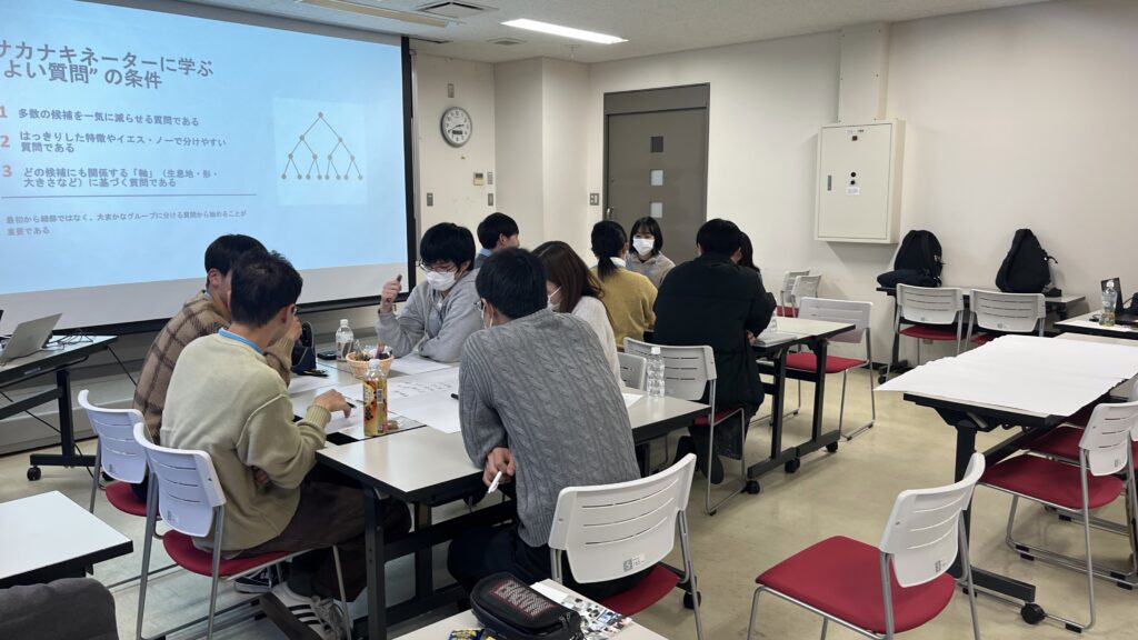 次に臨床推論とはどんなものなのかを実際に体験させていただきました。私はまだ二年生であり、大学での講義も基礎系の分野しか行っておらず臨床推論なんて行えるわけがないと感じていました。しかし、最初にさかなクンが動画内で行っていたサカナキネーターを参考に、どのような情報が重要でキーとなるかについてグループワークを行いました。そのグループワークではさかなクンがどのように情報を吸収し、頭で整理をし、最終的にどのようにして魚の特定に至ったかを考えることができ、情報から重要な要素を抽出する練習を行なえたと思います。