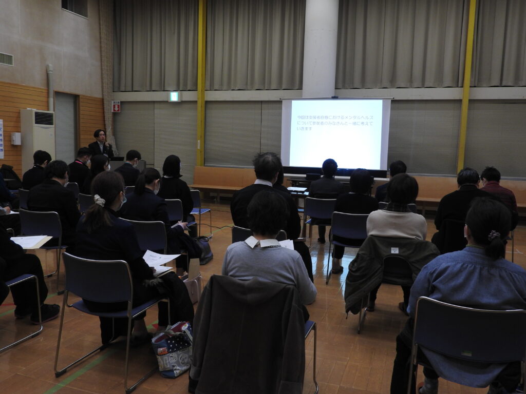 メンタルヘルスの大切さについて基本的な知識のレクチャーを岩橋先生が担当しました。これまでは患者さんやサービスの利用者への知識を勉強する企画でしたが今回は私達自身のケアを考える機会となりました。