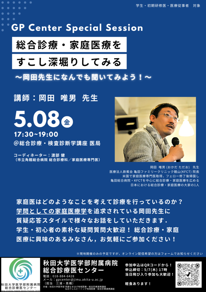 5/8夕方 岡田唯男先生Special Sessonのお知らせ!(総合診療の素朴な疑問に答えます!)